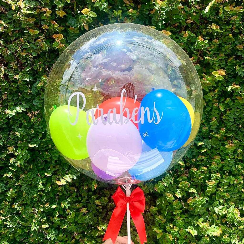 Balão Bubble com escrita “Parabéns”, e bexigas coloridas dentro.