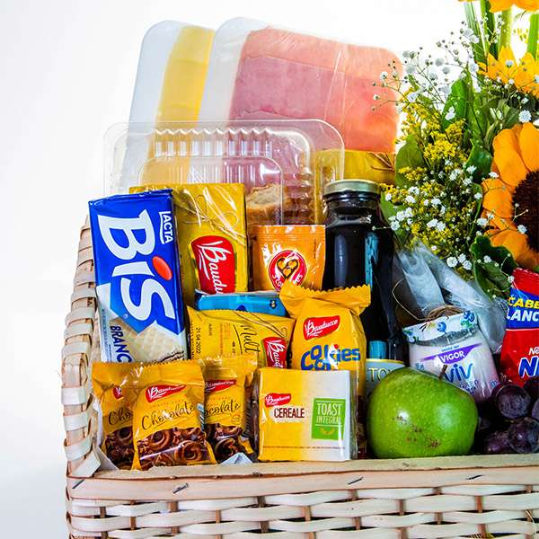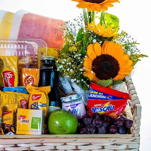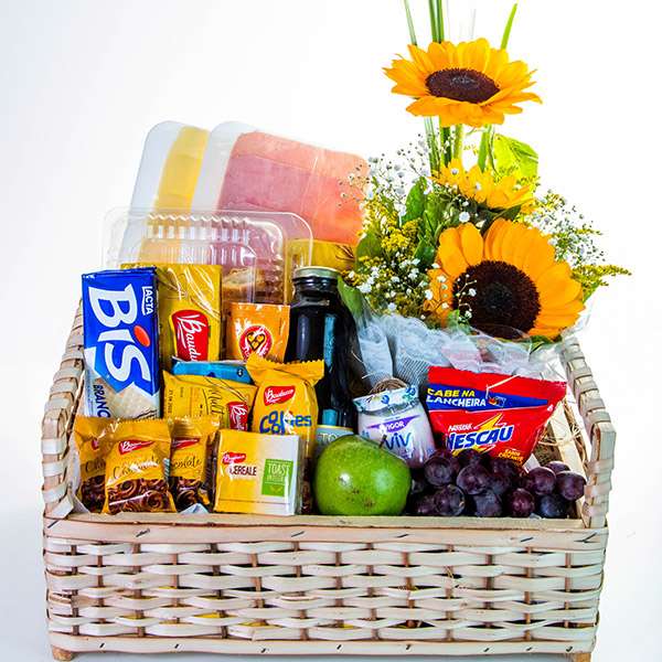 Com um lindo arranjo de girassol, a bandeja de café é composta por frutas da época, frios, iogurte, suco de uva integral, sucrilhos, sachê de capuccino, chocolate bis e diversos outros itens.