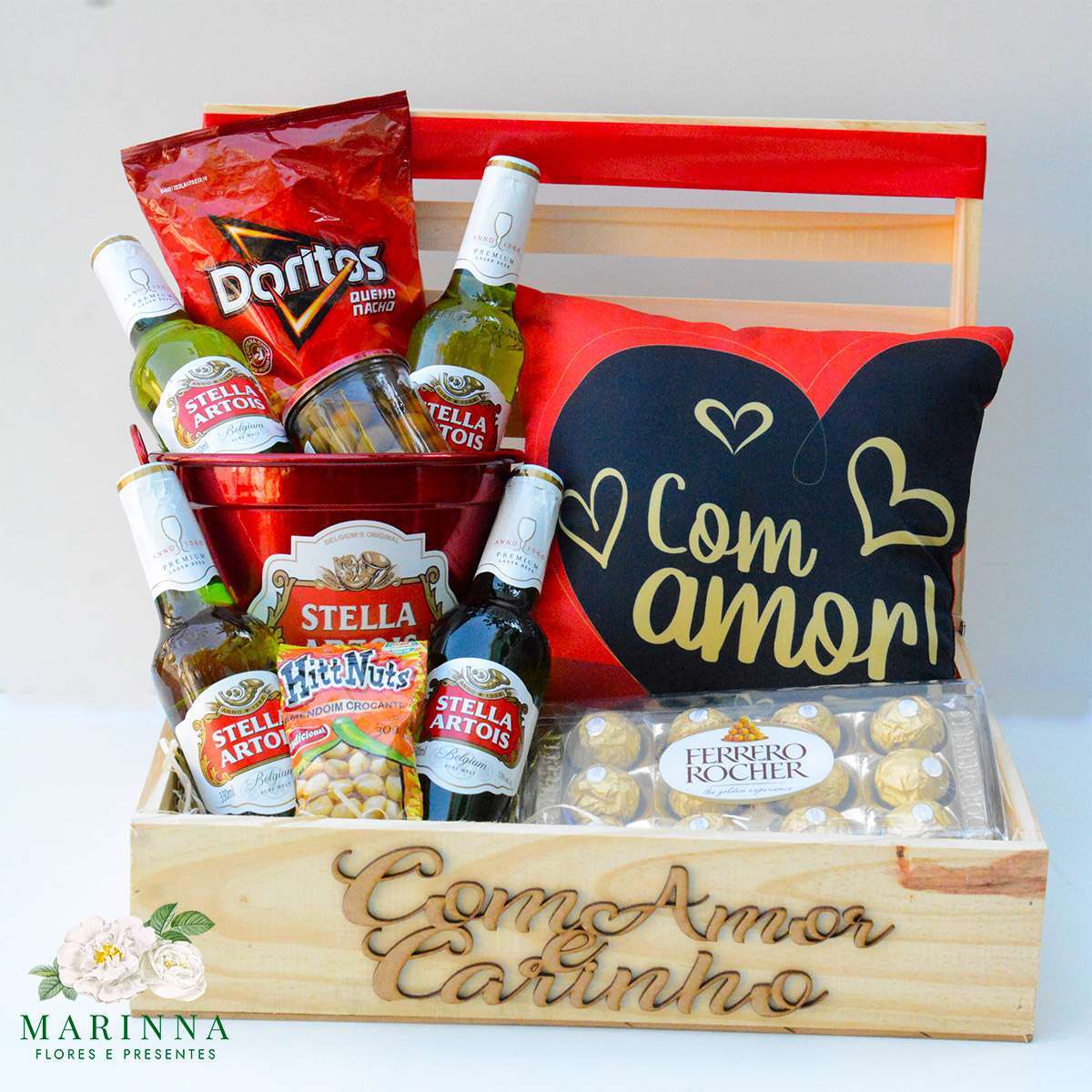Lindo baú de cervejas Stella, com almofada, chocolate, e quitutes. Incrível para presentear aquela pessoa especial que gosta de cerveja e merece um mimo!