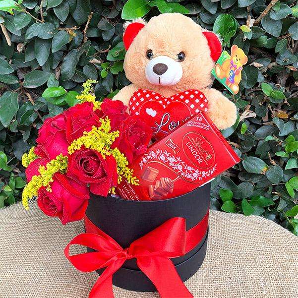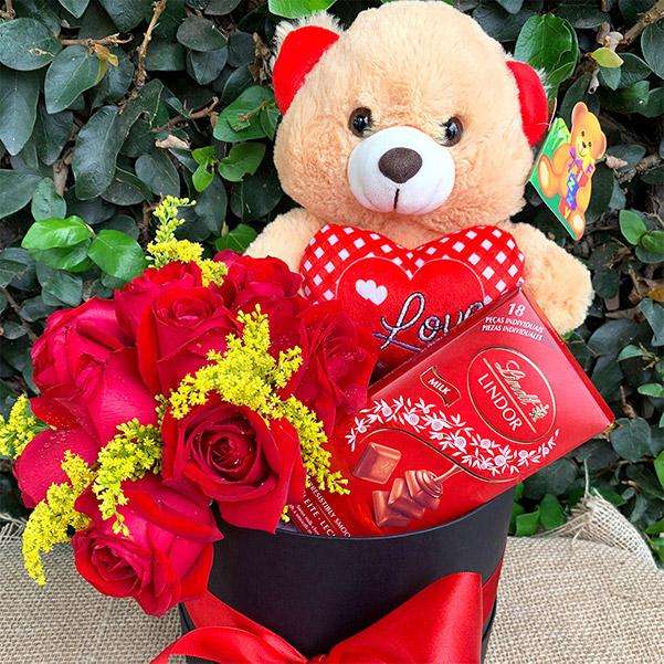Linda Box composta por buquê de rosas vermelhas, urso de pelúcia e chocolate lindt! As clássicas rosas vermelhas significam amor, romance e a mais profunda afeição por alguém. Para o amor da sua vida ou para aquele “amigo” que ainda não percebeu o seu interesse. Essas flores transmitem inocência, por isso, o tom é a escolha de muitas noivas para o buquê usado no dia do casamento.
