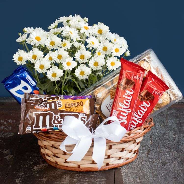 Formada por uma reforçada cesta recheada com os melhores doces como, por exemplo, barras de chocolate Suflair, bombons Ferrero Rocher e confeitos M&M´s. Um belo vasinho de margaridas brancas dá um toque extra de elegância ao presente, que é uma ótima sugestão para surpreender no aniversário, Dia do Amigo ou Dia das Mães.