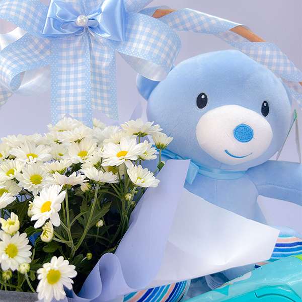 • Cesta decorada • Mini mamadeira • Urso de pelúcia • Sabonete Johnsons • Lenço Umedecido • Balão maternidade