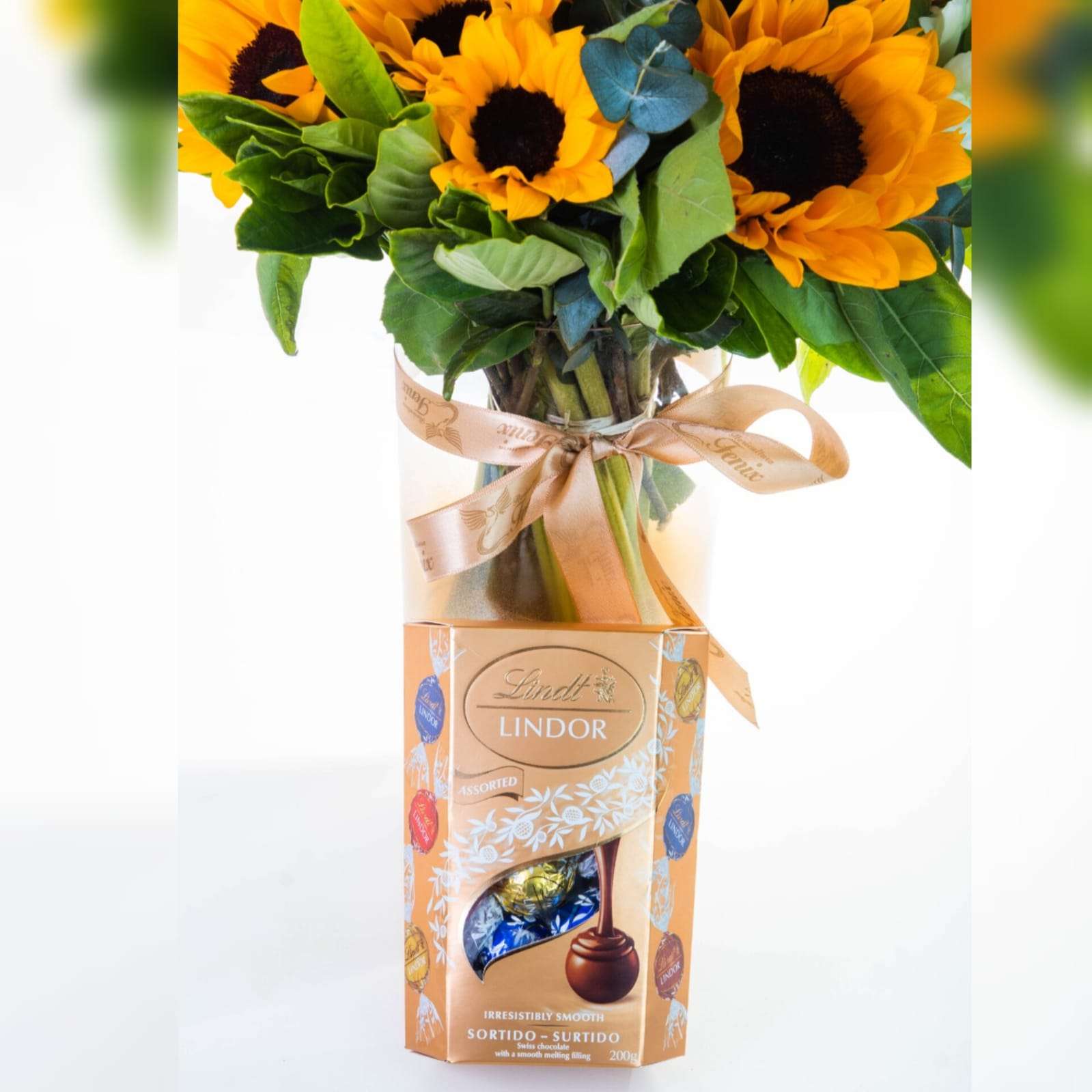 1 Arranjo composto por 12 girassóis, eucalipto, boca de leão, folhagens de gardênia
