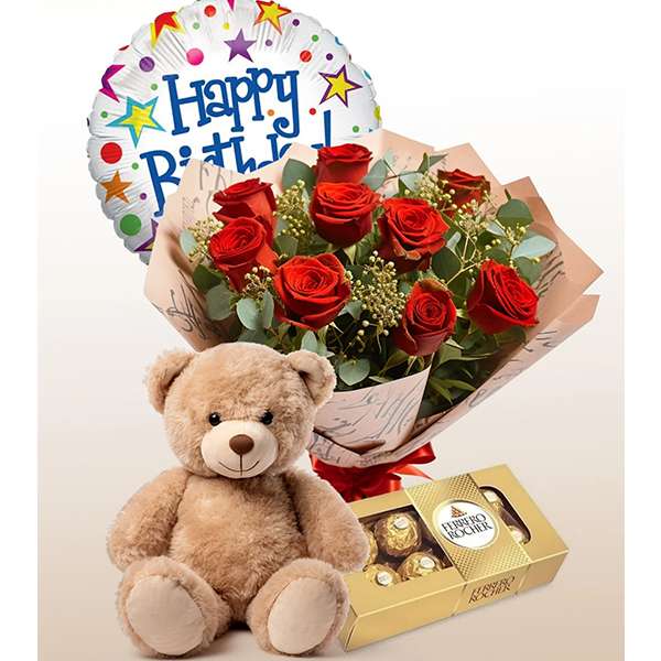 Encante seu amor com nosso kit romântico especial, que inclui um deslumbrante buquê de rosas, um balão ‘Happy Birthday’ para celebrar a ocasião, um delicioso Ferrero Rocher para adoçar o momento, e uma pelúcia fofinha para expressar todo o carinho. Este presente completo é perfeito para criar memórias inesquecíveis e mostrar o quanto você se importa.