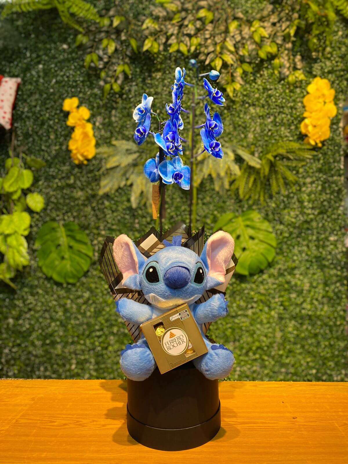 Lindo kit, para presentear uma pessoa especial! Orquídea azul rara, acompanhada de uma pelúcia do Stitch e um delicioso chocolate ferrero rocher.