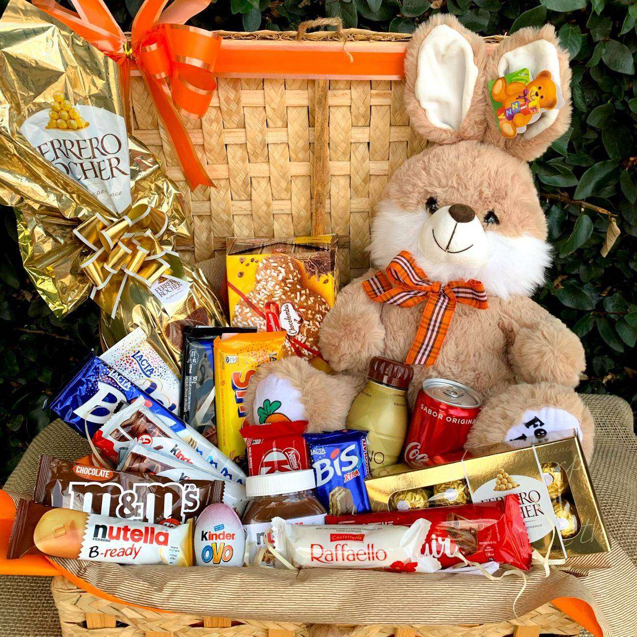 Belíssima cesta, recheada e completa de chocolates para a sua páscoa.