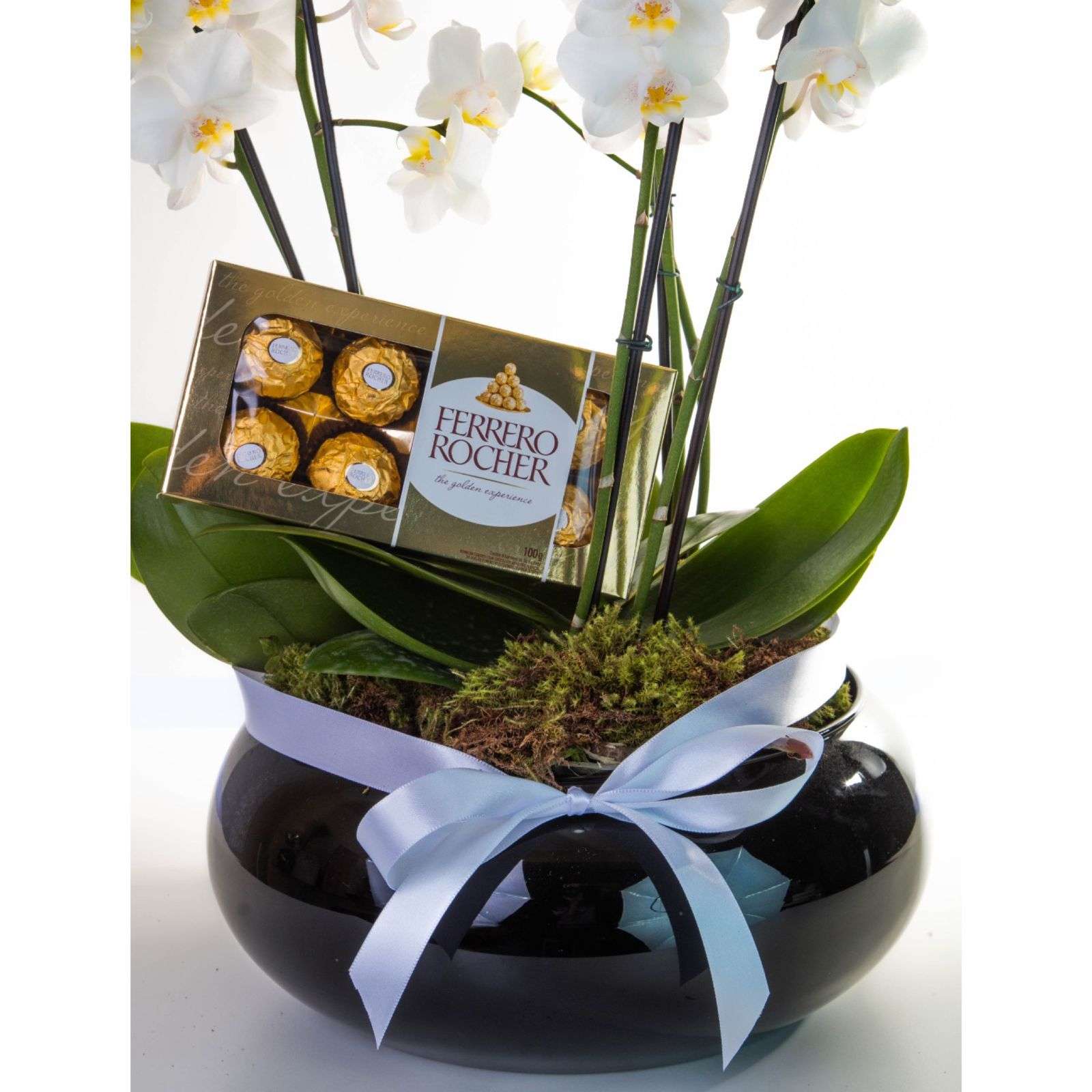Orquidário de 4 mini orquídeas brancas, em vaso de vidro sofisticado