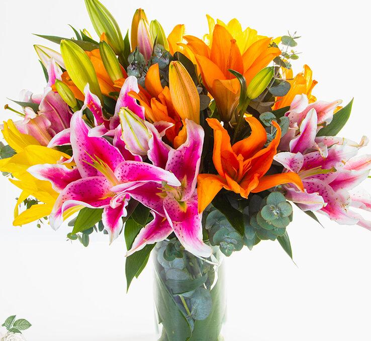 O Magnifico Arranjo de Lírios Colorido é perfeito para você surpreender a pessoa amada com desejos de prosperidade, alegria e carinho, além de expressar amor por ela. O presente é formado por delicados lírios nas cores rosa, laranja e amarela, disposto em um belo vaso de vidro cilindro. Ele é uma ótima sugestão de presente para Dia das Mães, Aniversário, Maternidade ou para quem está inaugurando a casa nova, pois combina e ilumina a decoração de qualquer ambiente
