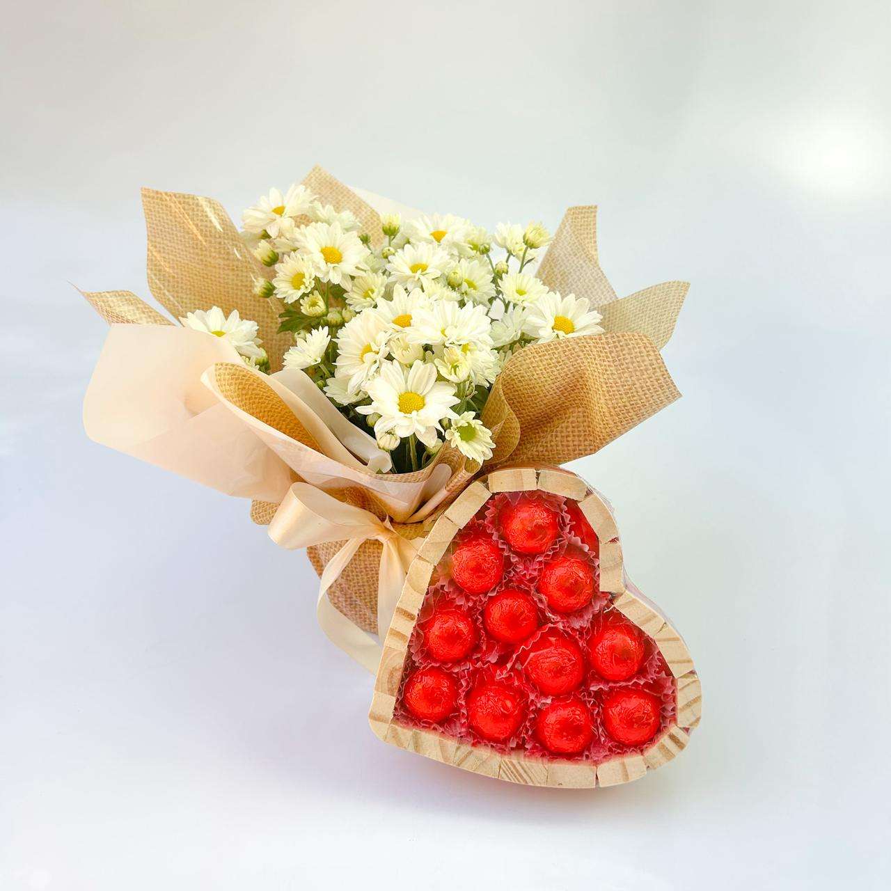 As margaridinhas brancas são flores associadas à leveza, pureza e alegria. Neste mini vaso delicado, elas ganham ainda mais charme quando combinadas com um coração de chocolate artesanal Bombonatti, criando um presente simples, elegante e cheio de carinho.