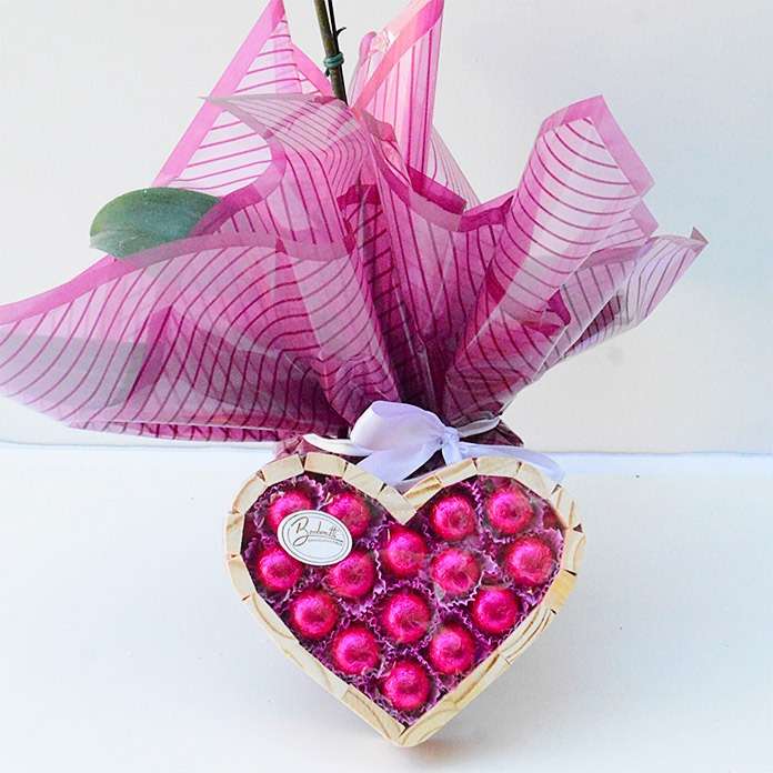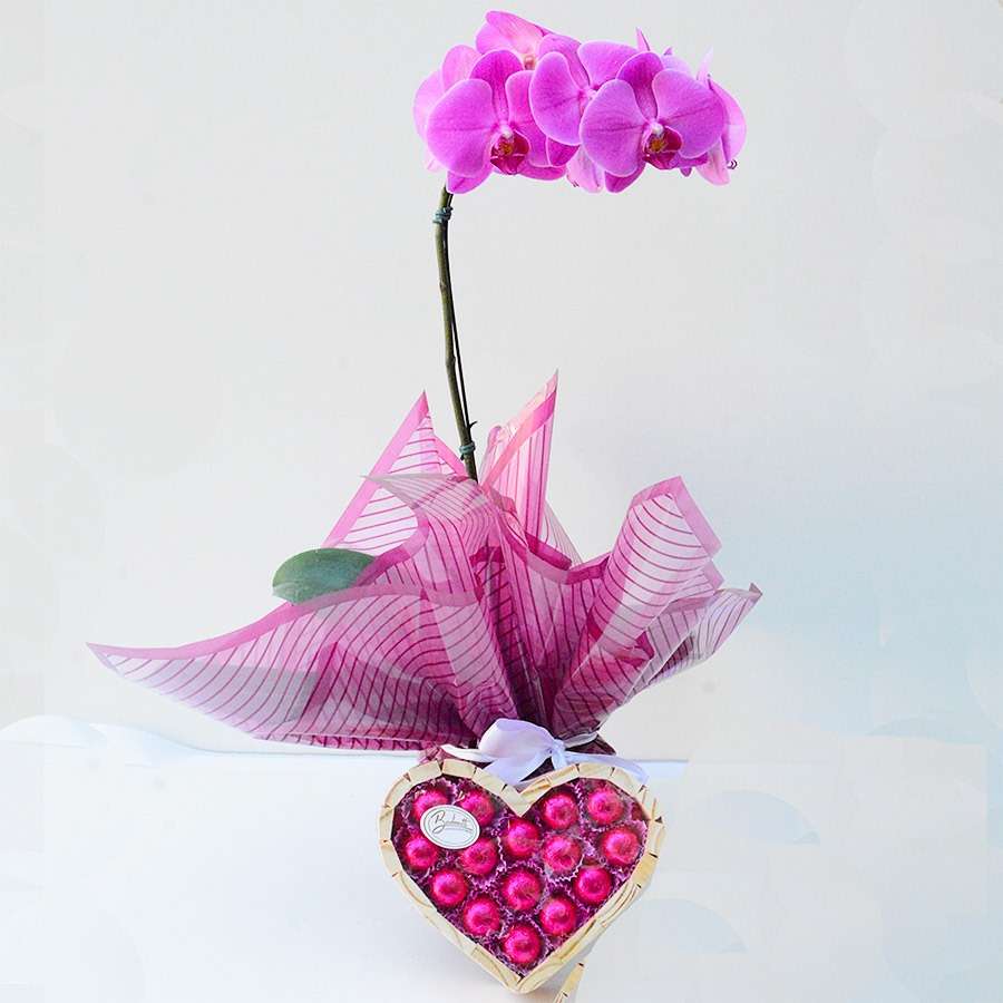 COMPOSIÇÃO: 1 orquídea pink decorada para presente 1 chocolate de coração ao leite 134g