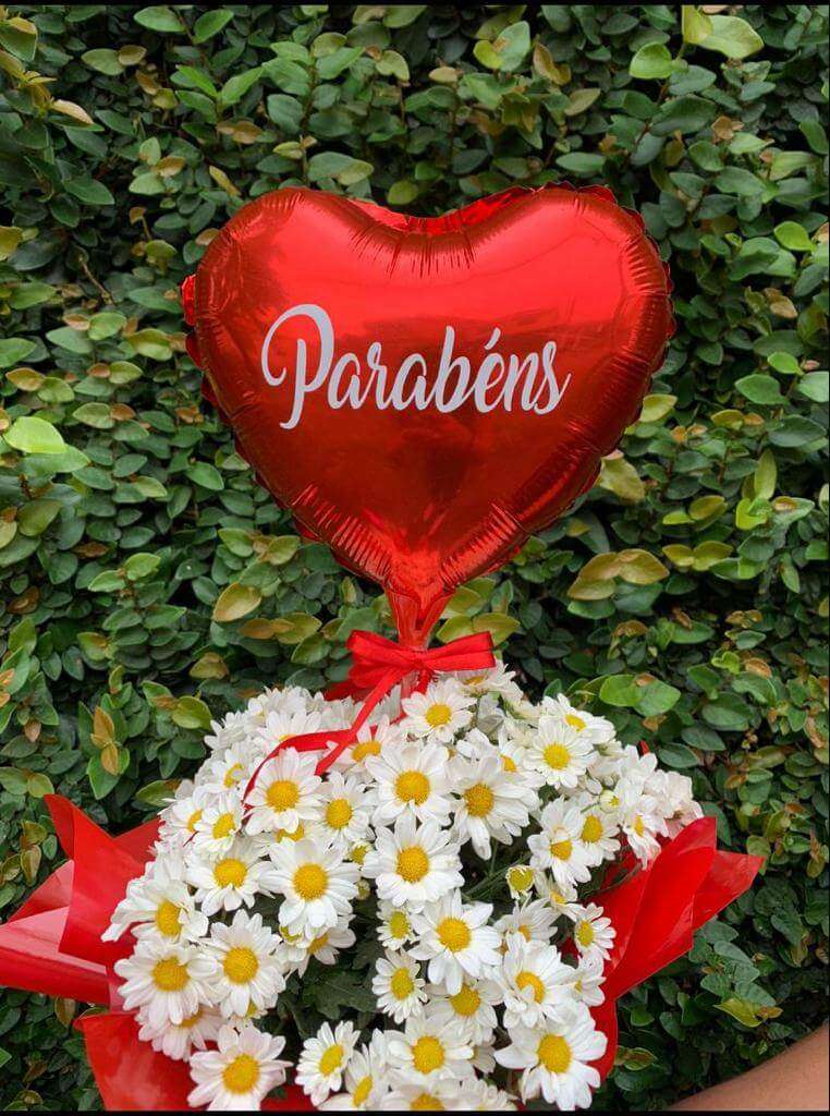 COMPOSIÇÃO; 1 vaso de margaridas plantadas 1 balão de coração pequeno “parabéns”
